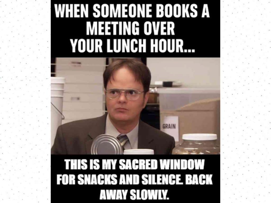 Lunch hour is sacred, a time for snacks, silence, and sanity. But when someone dares to schedule a meeting, channel your inner Dwight Schrute and protect your precious break at all costs!