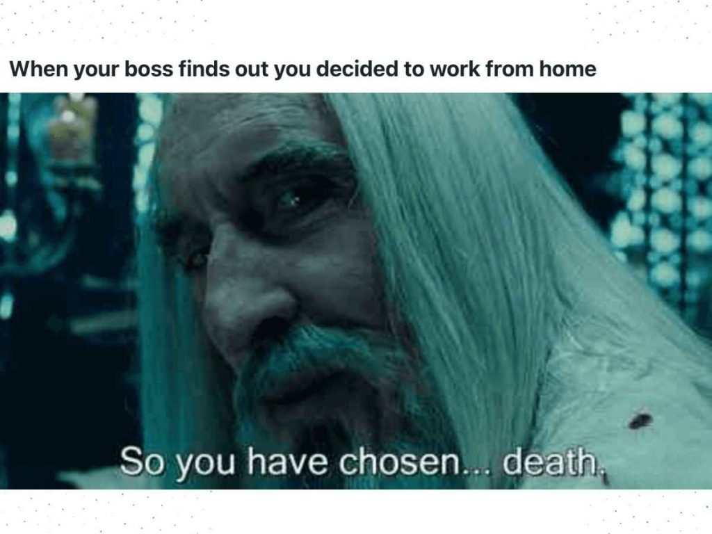 Working from home? Bold move. But when your boss finds out, prepare for a reaction as dramatic as Saruman declaring your fate. Remote work just got real!